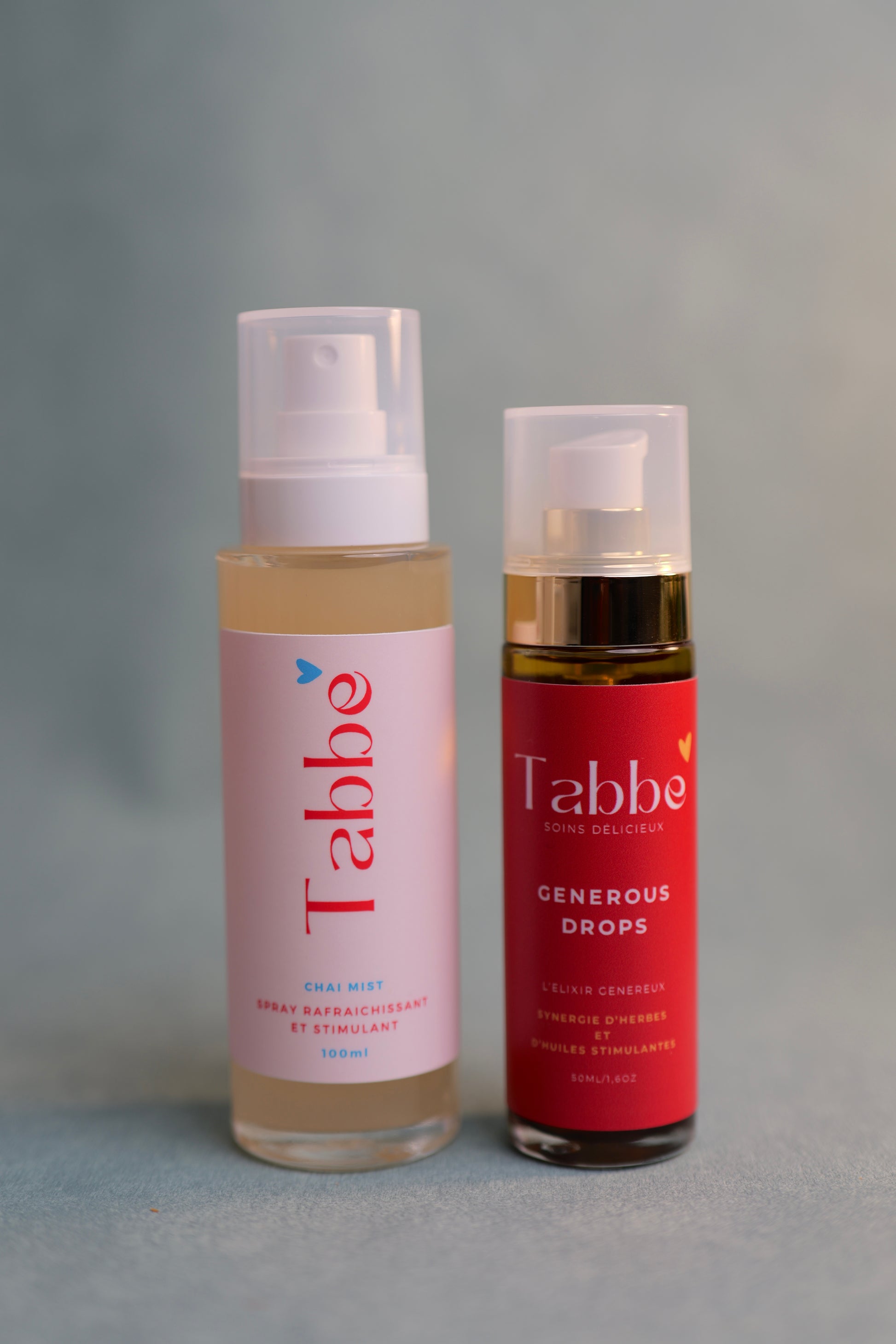 Chai mist: Rosmarinus Officinalis Leaf Water, Mentha Piperita Water, Aqua, Xylitol, Glycerin, Methylsulfonylmethane, Parfum, Caffeine, Aloe barbadensis leaf juice powder, panax ginseng root extract, Lecithin, Cocos Nucifera Fruit Extract, Sodium Citrate, Ascorbic AcidCitric Acid, Tocopheryl Acetate, Rosmarinus Officinalis Leaf Extract, Helianthus annuus seed oil, benzyl alcohol, sodium benzoate, potassium sorbate, dehydroactic acid, limonene, citral, citronellol, linalol. Generous drops:Ricinus Communis Seed Oil, Vitis Vinifera Seed Oil, Cucurbita Pepo Seed Oil, Nigella Sativa Seed Oil, Trigonella Foenum-Graecum Extract, Phyllanthus Emblica Extract, Bacopa Monnieri Extract, Eclipta Prostrata Extract, Rosmarinus Officinalis Leaf Oil, Mentha Piperita Oil, Lavandula Angustifolia Oil, Tocopherol.